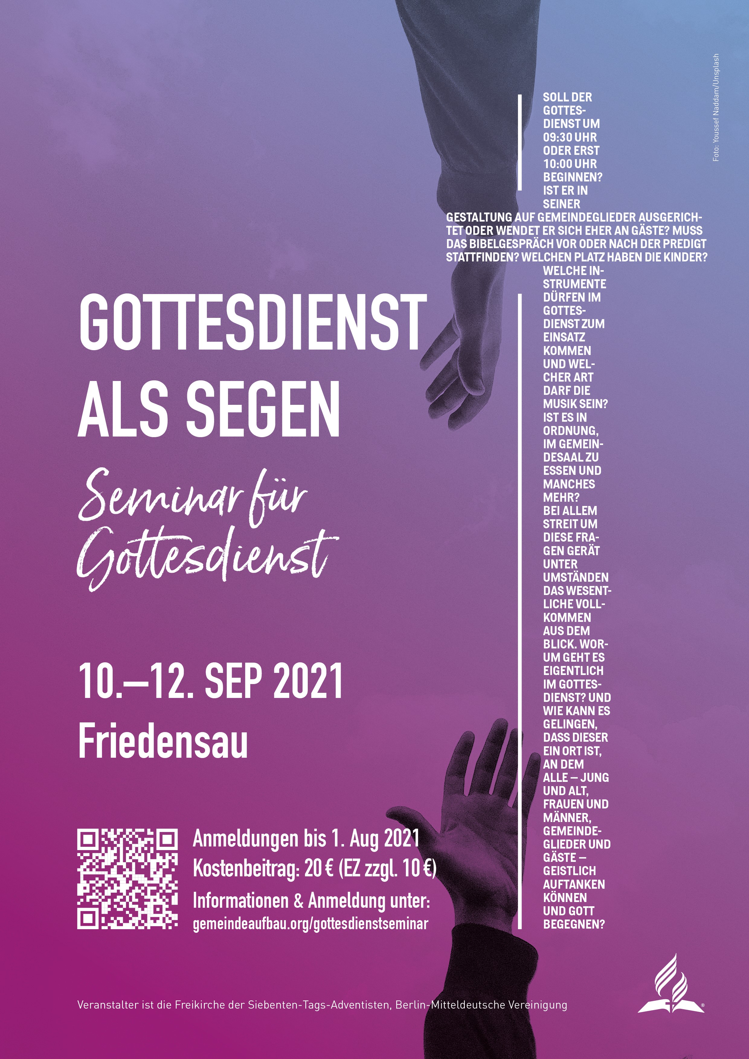 Das Seminarwochenende „Gottesdienst als Segen“ wird in Zusammenarbeit mit der Theologischen Hochschule durchgeführt und findet vom 10.-12.09.2021 in Friedensau statt. Der subventionierte Kostenbeitrag von 20,00 € soll allen interessierten Gottesdienstleitern, Gemeindegliedern u. Jugendlichen eine Teilnahme ermöglichen. Die Anmeldung ist hier möglich.